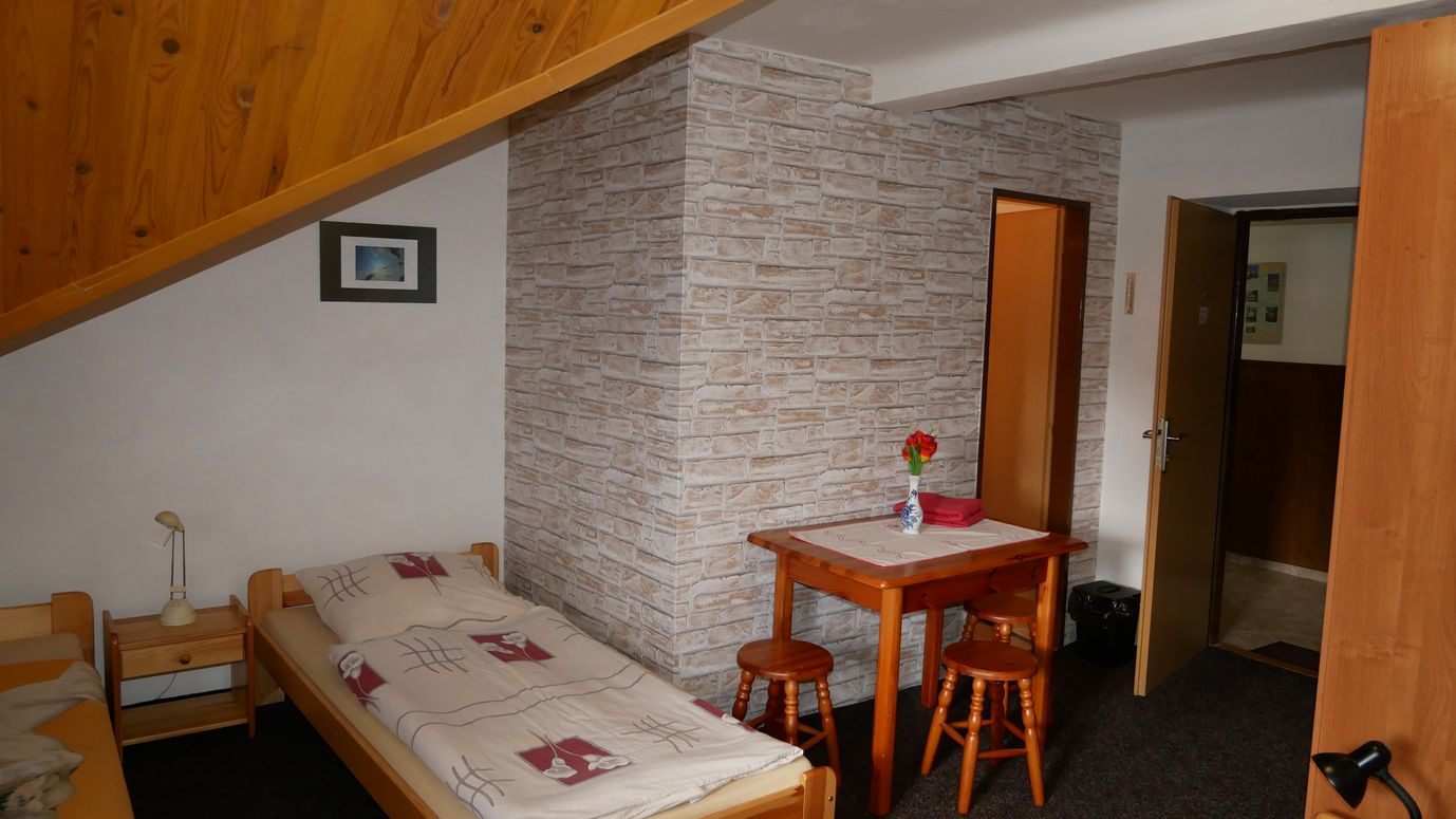 Nabízíme útulné pokoje se společnou kuchyní (2× dvoulůžkový, 2× třílůžkový) a tři prostorné apartmány s vlastním sociálním zařízením a lednicí. V celém objektu je dostupné Wi-Fi, možnost parkování v uzavřené zahradě a bezpečná úschova kol i lyží.